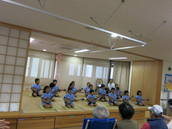 - 三味線を通して沖縄楽器に親しみ、楽器に触れ、簡単なマナーを習得し表現を学びます。簡単な部分演奏が出来るようになり、生活発表会で発表します。